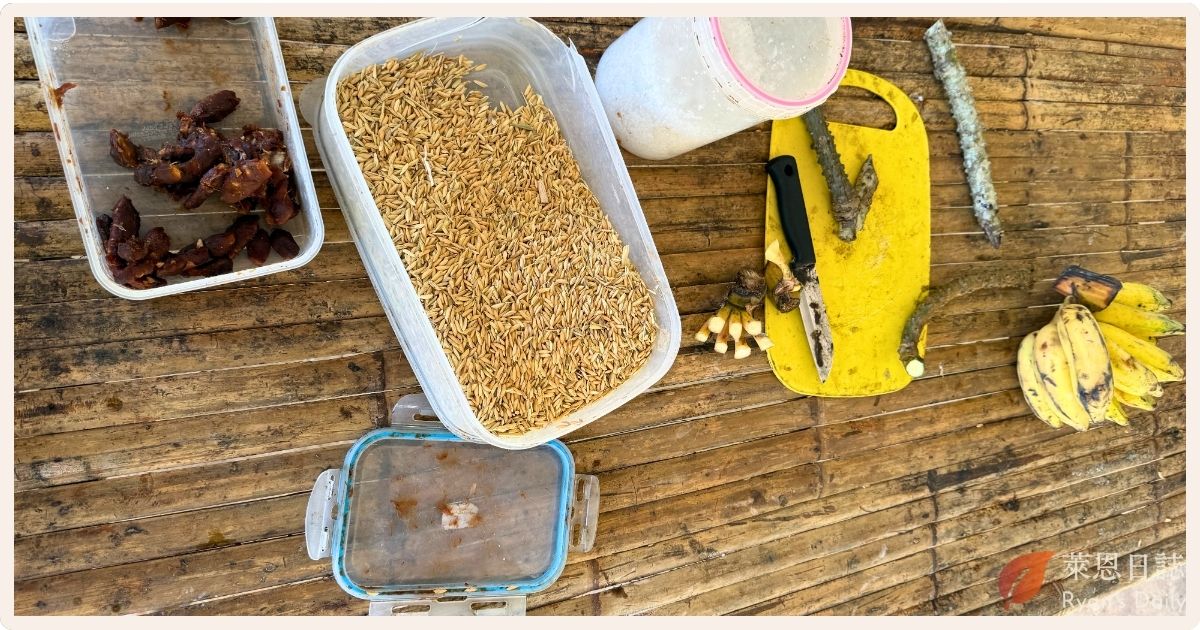 我們親手將甘蔗、米糠和香蕉搗碎,揉成一團一團的營養飯糰。